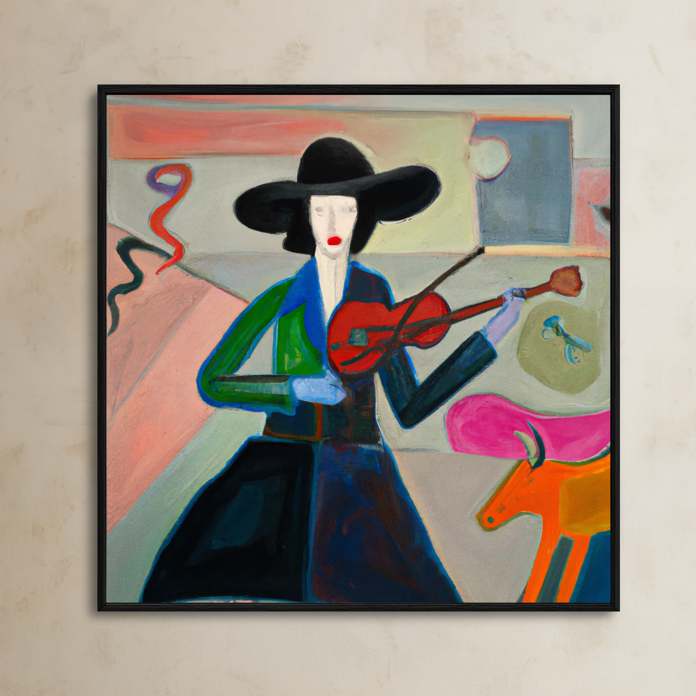 At its center, an elegant figure cradles a red violin, its quiet poise offset by surreal companions: a fluttering butterfly, a sculptural hat, and a sly orange creature that reads as muse, myth, or both. These layered symbols invite narrative without prescribing it, giving you—and your clients—the freedom to weave the piece into any high-concept story.