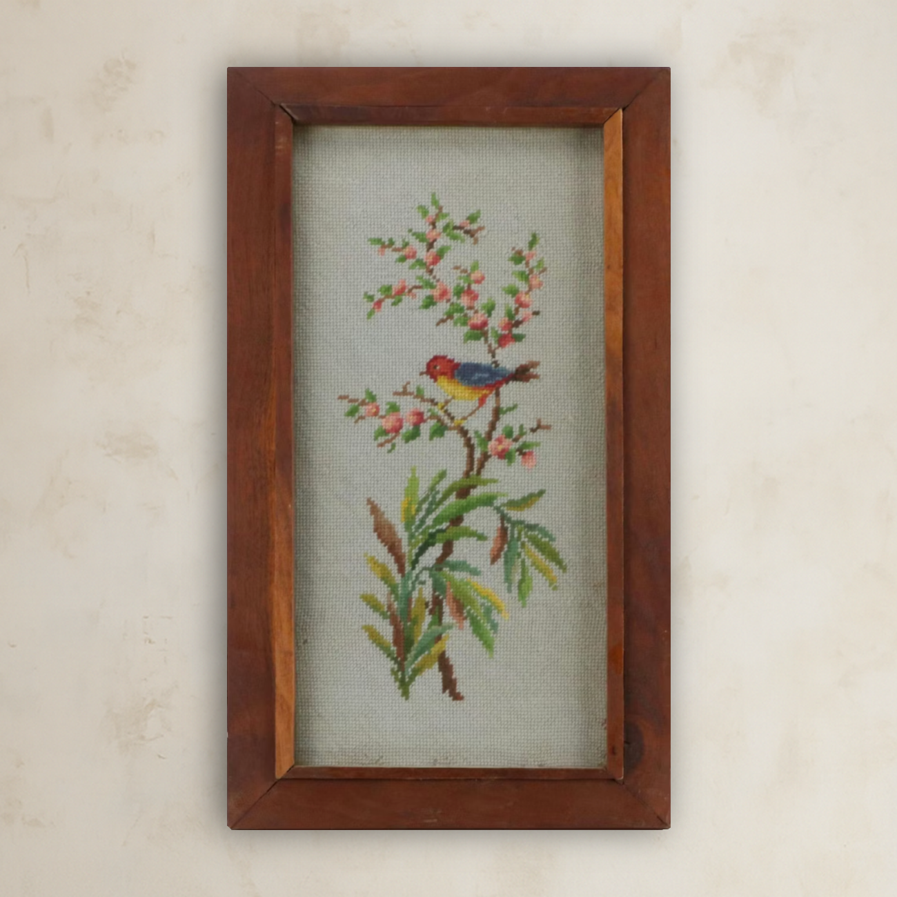 A delicate symphony of thread and artistry, this exquisite framed needlepoint evokes the timeless elegance of 19th-century craftsmanship. Every stitch of the vibrantly plumed songbird—perched serenely among blooming spring branches—whispers of pastoral tranquility and poetic refinement. The hand-embroidered tableau, executed with precision and grace, reveals a masterful eye for color and composition. It is more than textile—it is a portrait of nature’s tender voice, preserved through the hands of a devoted artisan. The rustic wooden frame, with its warm patina, cradles the work with understated nobility, drawing the eye inward to its radiant center.
