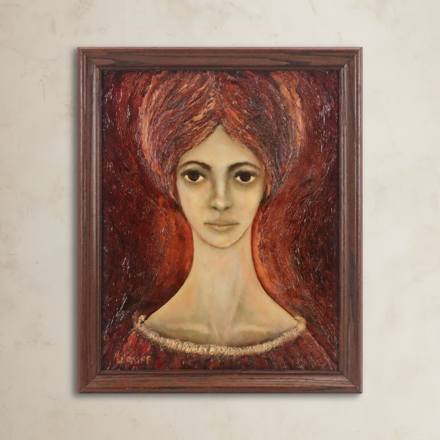 A hypnotic fusion of classical grace and surrealist tension, this mid-century oil portrait conjures a presence that is at once haunting and divine. The subject’s elongated neck and ethereal features evoke a Madonna-like reverence, while the intense gaze—piercing and soulful—pulls the viewer into a world both intimate and enigmatic. Swathed in a halo of textured, flaming crimson, the figure emerges from the background like a vision born of fire and spirit, echoing the Old Masters while pulsing with modern psychological depth. The textured impasto, rich with expressive strokes, captures not just a likeness but an essence—fragile, dignified, and eternally watchful.