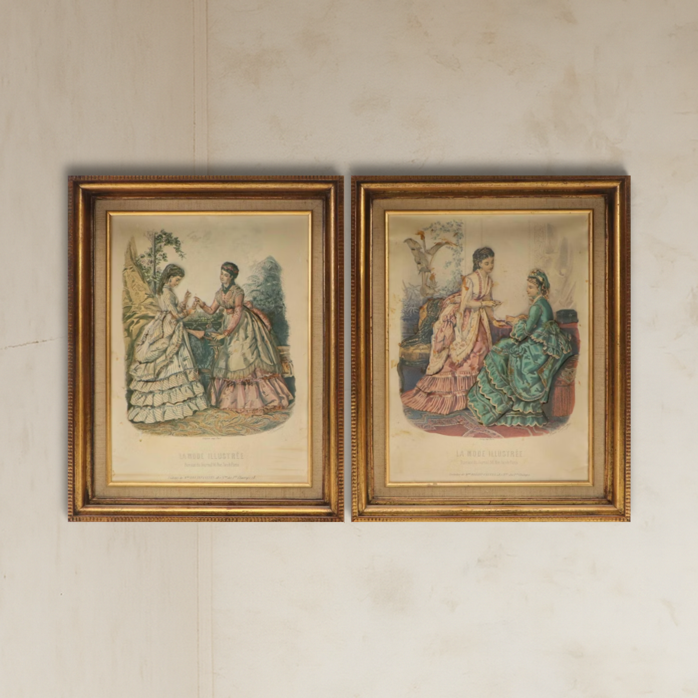 Step into the refined elegance of 19th-century Parisian fashion with this exquisite pair of La Mode Illustrée hand-colored relief prints, beautifully preserved in their original giltwood frames. These rare and richly detailed engravings are more than decorative objects—they are windows into the sophistication and social grace of la belle époque. Each scene is a masterclass in composition, where the intricacies of silk, lace, and embroidery are rendered with near tactile delicacy, inviting the viewer into a world where refinement was not simply admired, but expected. The tonal harmony between the soft pastels and vivid jewel tones speaks not only to artistic mastery but also to an era when elegance was paramount.